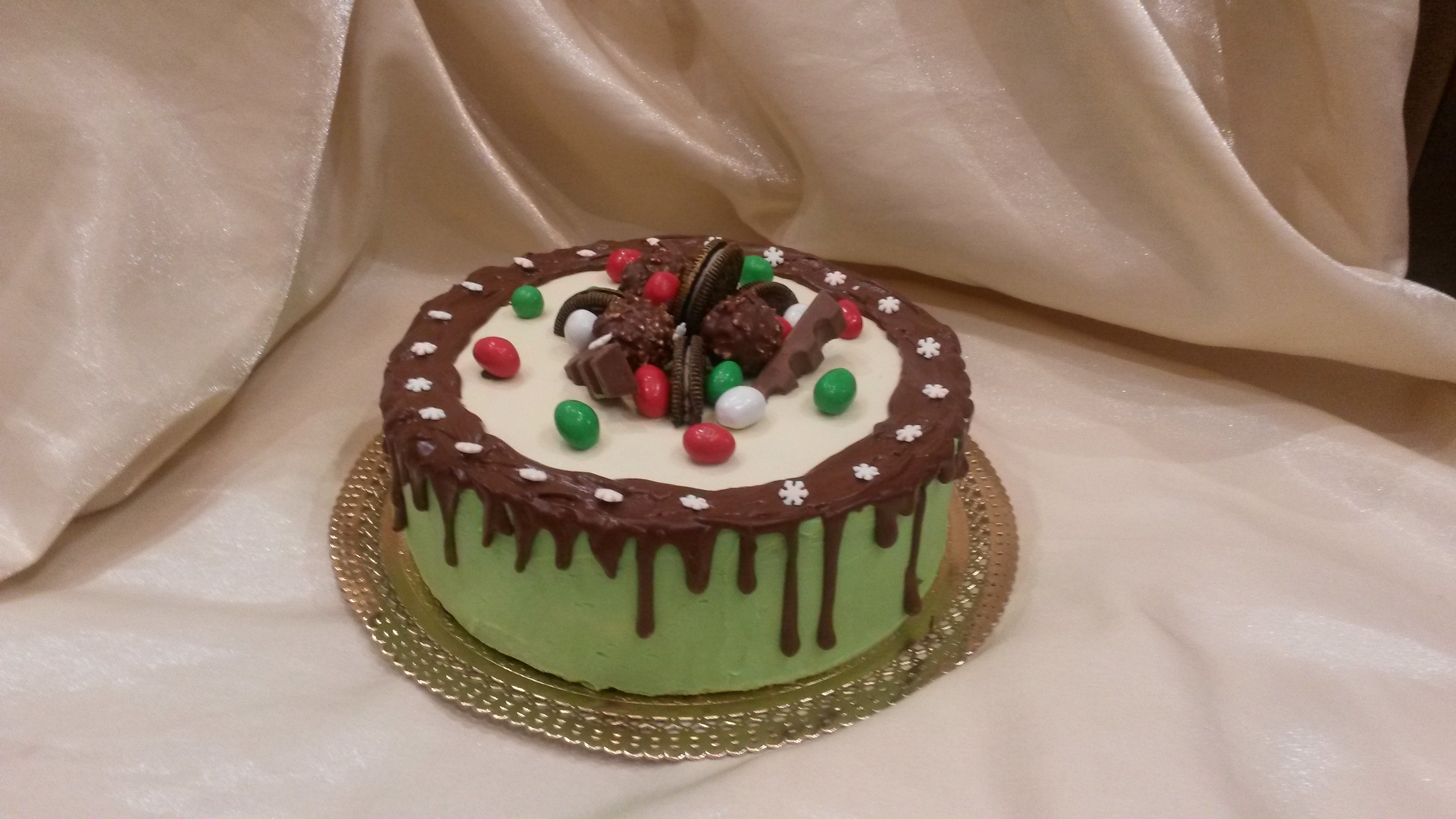 Внутри "шоколад на кипятке", сметанный крем, орехи и бананы. Покрывала ганашем из белого шоколада, украсила шоколадными подтеками и всякими вкусняшками (конфеты "фереро роше", М&М, шоколад "Киндер" и печенье "Орео", подкрашенное золотым кандурином) Подтеки конечно не очень получились, но для первого раза думаю пойдет..