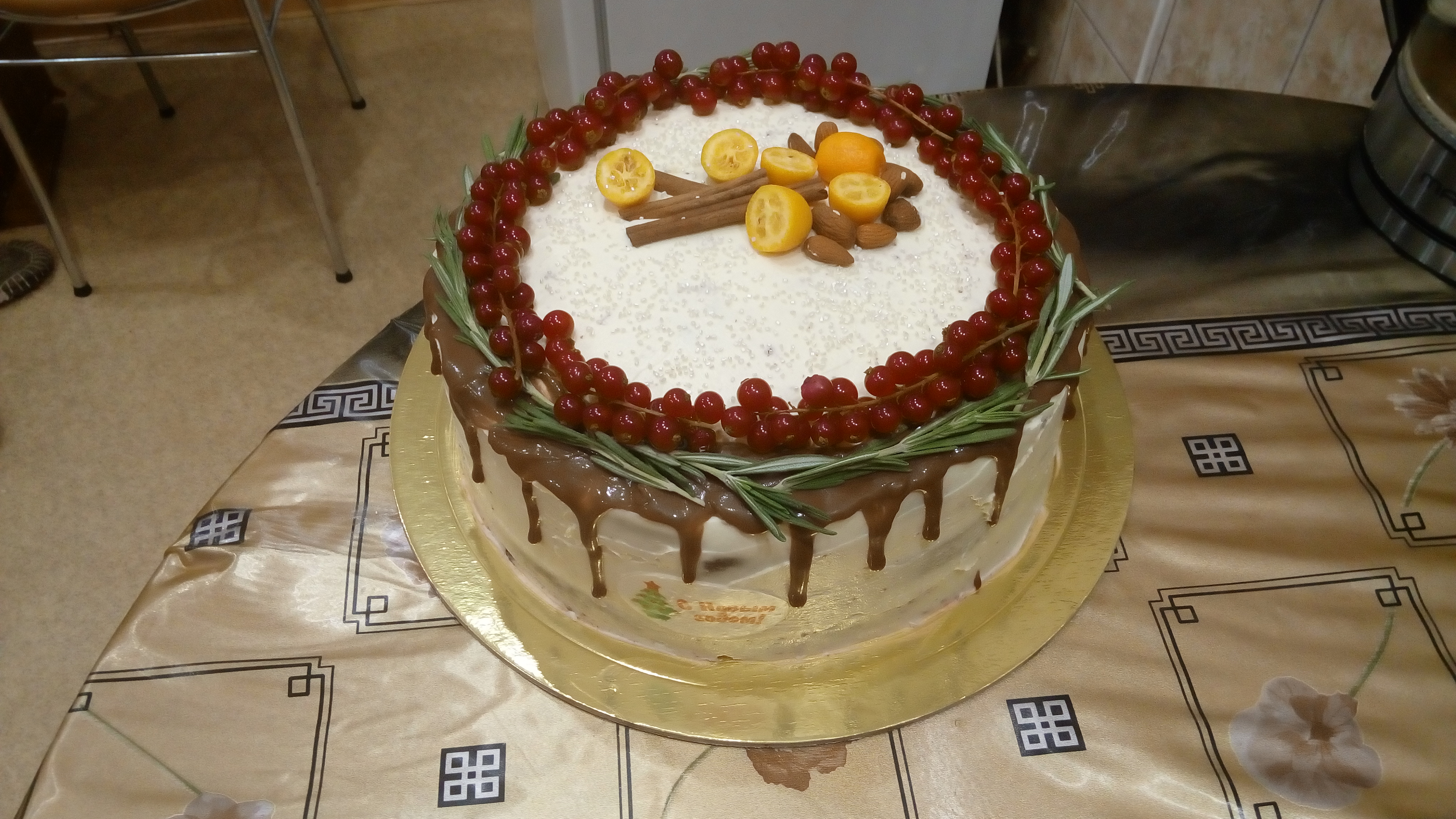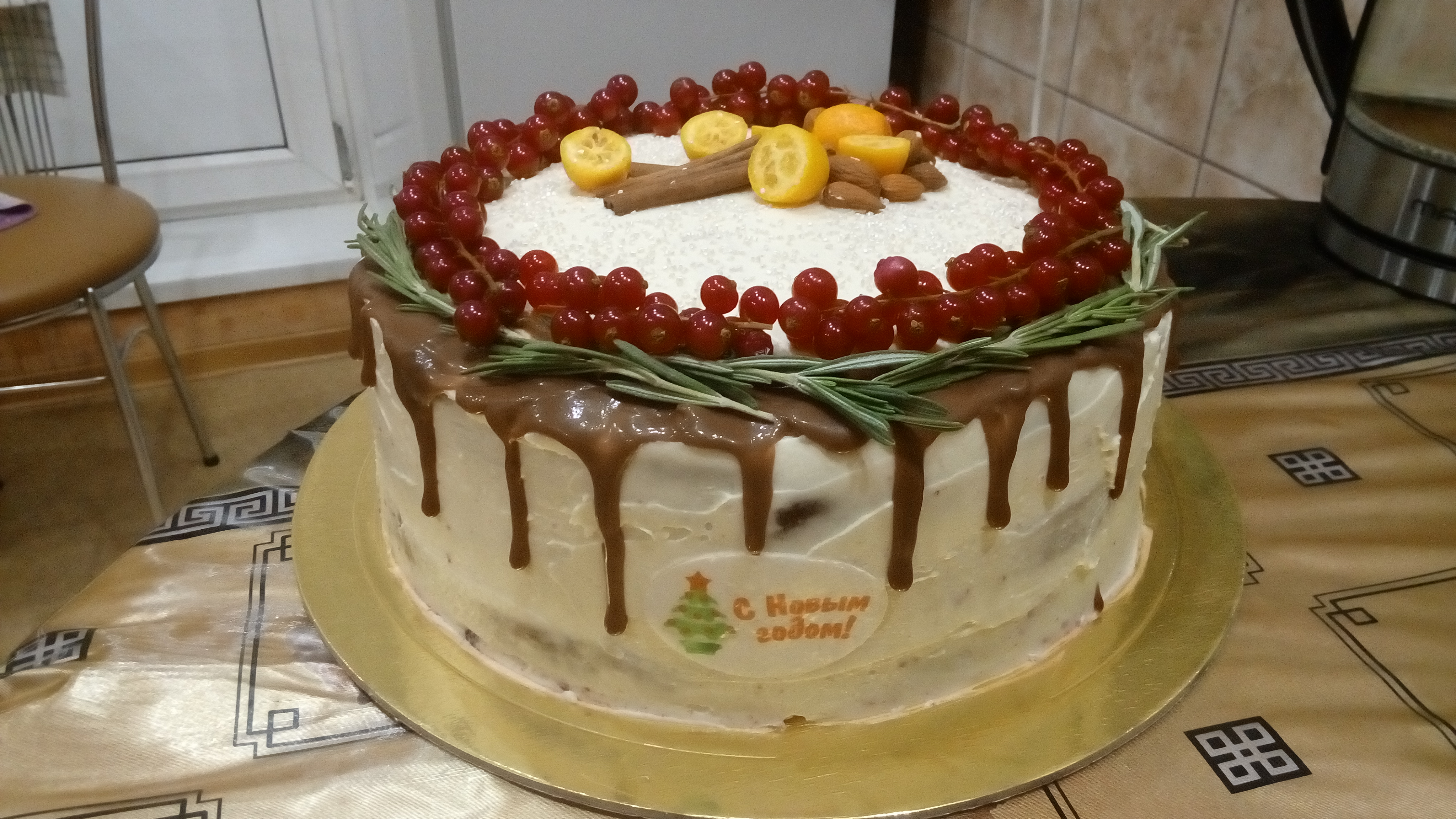 Тортик на Новый год!Торт на раз,два,три.Сылку скину желающим.Крем чиз с вишней и сиропом из вишни.Ровняла торт тем же кремом "чиз". Сверху веточки розмарина и смородина красная,палочки корицы и кумват