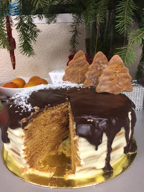 Медовик, с заварным кремом, сверху ганаш из темного шоколада.