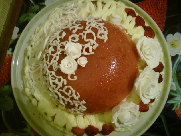 Торт с клубникой и маскарпоне. Для бисквита: 4 яйца Стакан сахара Стакан муки Для крема: 500 г маскарпоне 4 яйца 80 г сахарной пудры щепотка соли 1,5 ст.л. желатина Для верха: 150-200 г клубники Желатин для торта, (способ приготовления см. на пакетики советую взять 2 ст.ложки, так как 1ст. ложки мне паковалось мало. Клубничка начала в некоторых местах подсыхать ) разъемная форма 23-26 см Способ приготовления бисквита: 1. Отделяем белки от желтков 2. Начинаем взбивать белки на самой маленькой скорости миксера. Медленно, по одной ложке добавляем сахар и всыпаем ваниль. 3. Когда белковая масса станет белой и довольно плотной, так же по ложке добавляем желтки, продолжая при этом взбивать. 4. Убираем миксер и начинаем просевать в миску с белками муку, аккуратно вымешивая ложкой по направлению снизу вверх. 5. Готовое тесто выливаем в смазанную маслом форму и отправляем в разогретую до 190-200 градусов духовку на 20-25 минут. 6. Главное правило при выпечке бисквита - не открывать дверцу духовки - иначе опадет. Когда подойдет время, вынимаем форму и переворачиваем бисквит на тарелку и даем остыть. Способ приготовления крема: 1. Приступаем к крему. Желатин заливаем 4 ст.л. воды, даем набухнуть, затем на плите доводим до растворения (не даем закипеть!). Остужаем почти до комнатной температуры. 2. Яйца разделяем на белки и желтки. Желтки взбиваем до просветления с сахарной пудрой. Пару столовых ложек массы смешиваем с желатином, затем добавляем эту смесь в большую миску с желково-сахарной смесью и хорошо перемешиваем. 3. Добавляем маскарпоне комнатной температуры и размешиваем до получения гладкой однородной массы. 4. Белки взбиваем со щепоткой соли в крутую пену. 5. В два приема соединяем белки и желтково-сырную массу, бережно перемешивая движениями снизу вверх 6. Кладем корж в форму. Сверху выливаем крем. 7. Ставим в холодильник, чтобы крем схватился. Я поставила на ночь. 8. Клубнику нарезаем ломтиками и укладываем поверх застывшего крема. 9. Готовим желе из пакетика по соответствующей инструкции. Остужаем до комнатной температуры и заливаем клубнику. Ставим торт в холодильник на 4 часа. Аккуратно проводим тонким ножом вдоль бортика формы и снимаем его. Приятного чаепития! |