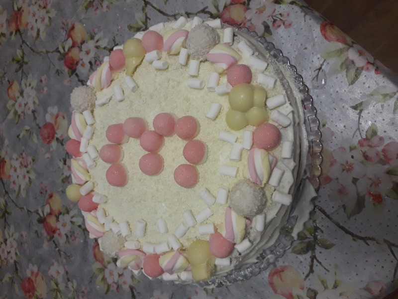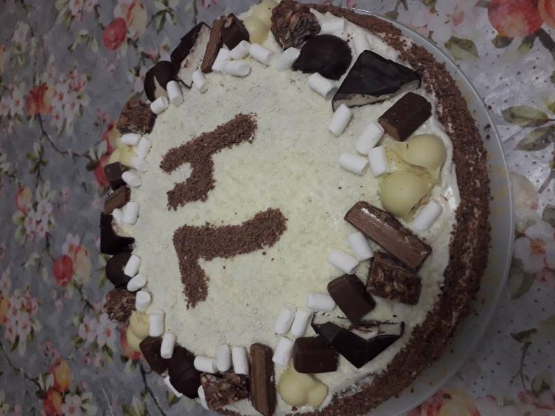 Хочу поделиться идей украшения домашних тортиков. У меня бисквитный тортик - кожи на сгущенке, пропитывала сахарным сиропом и смазывала кремом (сливки + сахарная пудра). А украшала тертым шоколадом, конфетами.