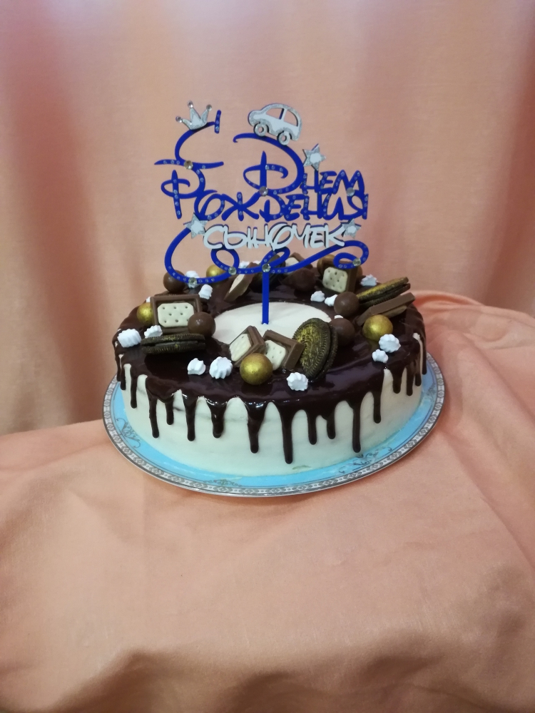 Сверху просто обмазан кремом, подтеки делала вообще просто (шоколад темный грамм 70 растопила в 40 гр сливок 10%, в микроволновку на 1 мин и мешать до полного растворения шоколада) и ложечкой делала подтеки по кругу + сверху этим же шоколадом рисунок. Ну и клубника + орео.