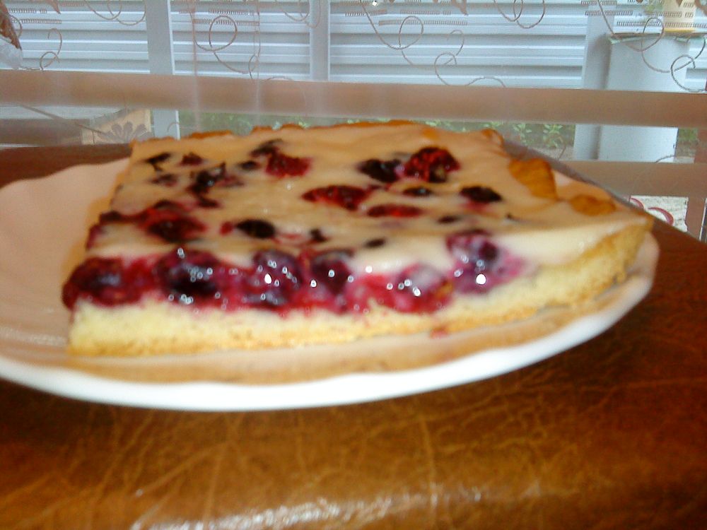 Пирог с черной смородиной. Ингридиенты: 1 яйцо 200 гр сахара 600-800 гр муки 1ч.л. соды гашеная в уксусе 4-5 ст. л. сметаны 100 гр. растопленного сливочного масла Начинка: Любая ягода Помадка: 200 гр. сметны 200 гр. сахара Сахар, яйцо, соду, масло, сметану взбиваем миксером до однородной массы. Добавляем муку и вымешиваем тесто. Тесто должно не прилипать к рукам, но и не быть крутым. Раскатываем пласт и выкладываем на смазанный маслом противень. Тесто легко рвется, поэтому я укладывала его частями, а пальцами просто приминала стыки, оно хорошо склеивается. Сверху выкладываем ягоду. У меня была свежая черная смородина и малины чуть чуть. Ягоду можно заменить на любую другую. Выпекаем при температуре 180 градусов 20-25 минут. Я первые 15 минут пекла на 180, а потом убавила до 120 и допекала еще 15 минут, но у меня духовка дурацкая. Готовый пирог заливаем сверху помадкой (взбить сметану с сахаром) мне понадобилось меньше, поэтому я бы использовала по 150 гр. сметаны и сахара. Пирог ставим обратно, уже в выключенную, духовку, пока она не остынет. Фотки не очень, т.к. на телефон, но он оооочень вкусный. Вложение: Вложение: