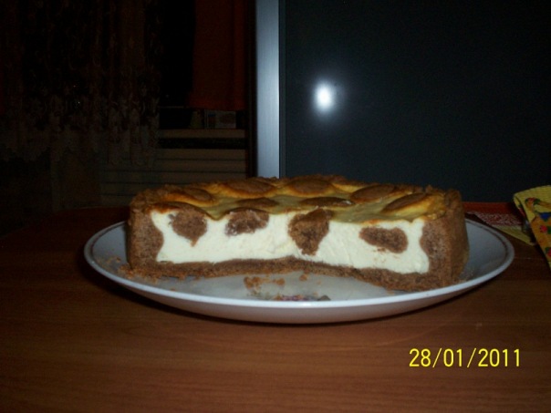 Тесто 200 г маргарина ( у меня масло сл.) 1 яйцо 150 г сахара 350 г муки 50 г какао 1 пакетик (10 г) разрыхлителя Начинка 500 г творога( нежирного) 4 яйца 200 г сл.масла ( у меня 100гр масла сл. + 100гр сметаны (или просто 200гр сливок) 2 ст. ложки крахмала щепотка ванили 150 г сахара. Приготовление: Масло комнатной температуры взбить с сахаром до однородной массы. Просеянную муку смешать с какао-порошком и разрыхлителем. Соединить все эти составляющие и замесить тесто. Отделить и отставить в сторону где-то 1/5 часть теста на пятнышки. Начинка: В исходном рецепте все ингредиенты начинки смешивают сразу.Так и надо! А то я в первый раз отдельно белки взбила, так у меня так начинка поднялась, что к потолку духовки прилипла)))) Смазала форму сливочным маслом Выложила тестом форму. Делать бортики 4-5 см Выкладываю начинку на тесто. Разравнивнять Оставшуюся часть теста раскатываю в лепёшку Рву лепёшку на произвольные кусочки, в форме пятнышек коровы, и раскладываю на торт Выпекать 60мин Дать остыть торту. Поставить в холодильник на 3-4часа.(я на ночь)