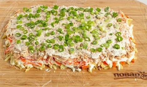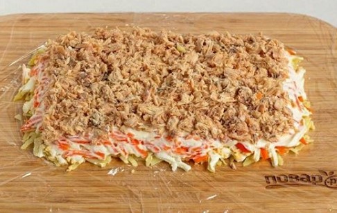 Вложение: ✳Ингредиенты: Горбуша консервированная — 250 г Картофель — 3 шт Морковь — 1 шт Яйцо — 3 шт Лук зеленый — Пучок (небольшой) Майонез — По вкусу Соль — По вкусу Салат листовой — По вкусу (для подачи) Количество порций: 8-10 ✳Как приготовить: Подготовьте все необходимые ингредиенты. Картофель, морковь и яйца заранее отварите в подсоленной воде, остудите и очистите. Досочку застелите пищевой пленкой, на нее будем выкладывать салат в виде прямоугольника. 1 слой: вареный картофель натертый на крупной (можно мелкой) терке и майонез. 2 слой: натертые яйца. 3 слой: натертая вареная морковь и майонез. Горбушу очистите от костей и кожи, разомните вилочкой. Выложите четвертым слоем и сверху немного майонеза. Завершаем небольшим количеством зеленого лука. Теперь аккуратно с помощью пленки подтяните салат вверх к середине с одной и с другой стороны, кончики также прикройте пищевой пленкой и уберите в холодильник на несколько часов. Затем с помощью острого ножа разделите на порции и подавайте к столу на листьях салата.