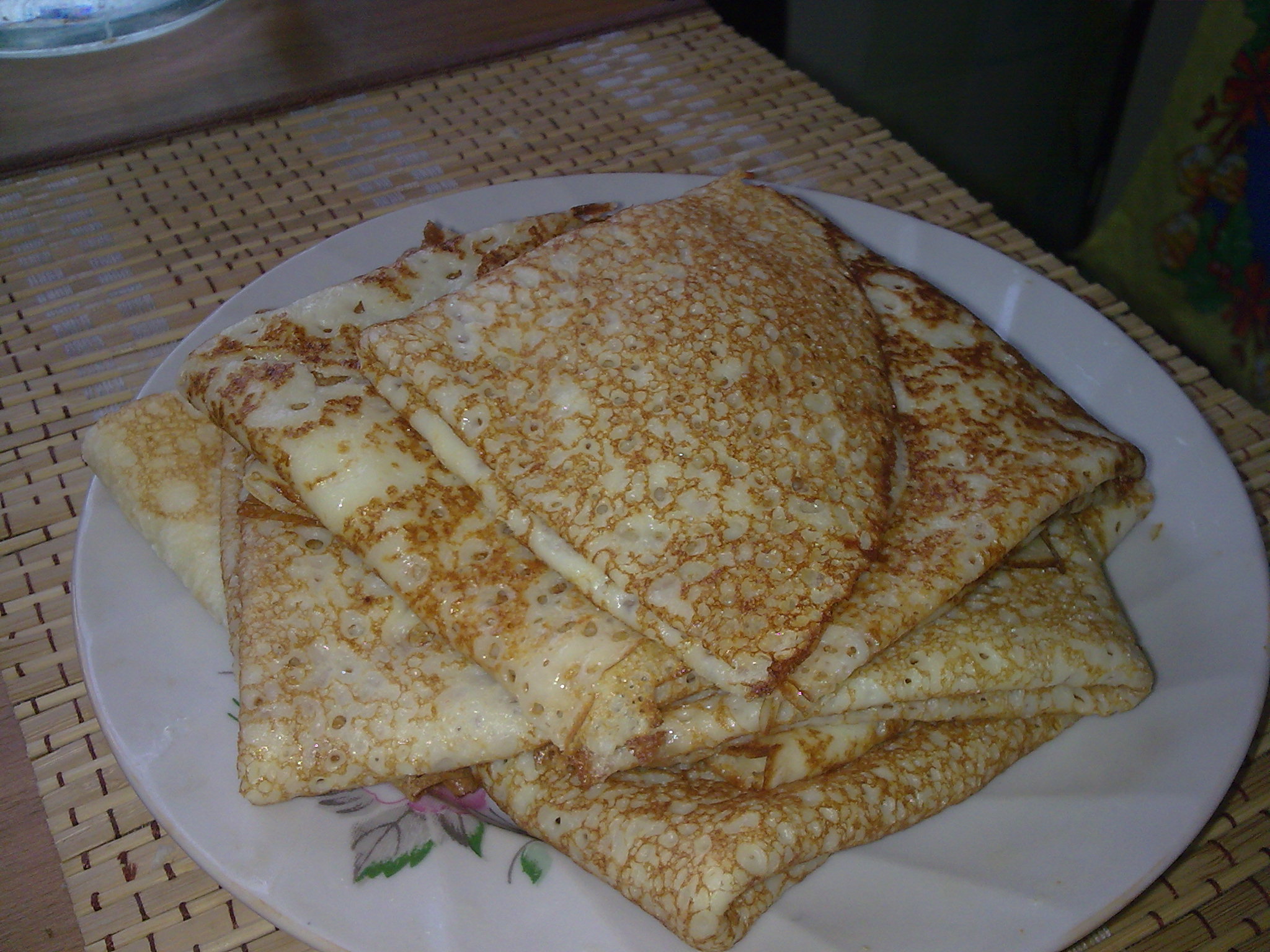 400 кефира (или кислого молока) 2 яйца щепотка соли 2 ст.л. сахара 50 гр. растопленного сливочного масла 5 ст.л. муки с горкой щепотка соды. все смешать и жарить - получаются тонюсенькие и очень вкусные и главное дырочки даже на тефлоне :) ◊ Лучше иногда падать, чем никогда не летать. |