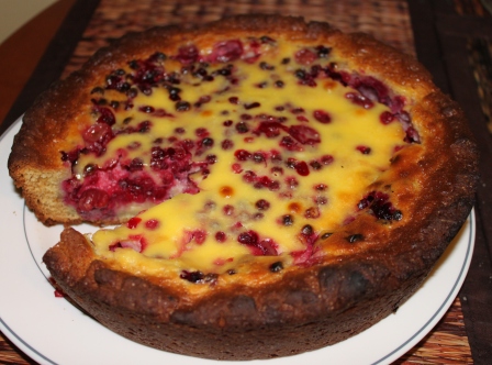 Пирог "Ягодное раздолье" Для теста: 150 г творога, 5 ст.ложек растительного масла, 5 ст.ложек молока, 100 г сахара, 200 г муки, 0,5 ч.ложки гашеной соды. Для начинки: 500 г лесных ягод (или любые другие), 300 г сметаны, 2 яйца, 100 г сахара, 2 ч.ложки крахмала. Творог смешать с растительным маслом, молоком и сахаром, добавить соду. Осторожно вмешать муку и замесить тесто. Тесто выложить в форму, смазанную маслом, сформировав бортики. На тесто выложить ягоды и залить сматаной, смешанной с сахаром, яйцами и крахмалом. Выпекать пирог примерно 45 минут