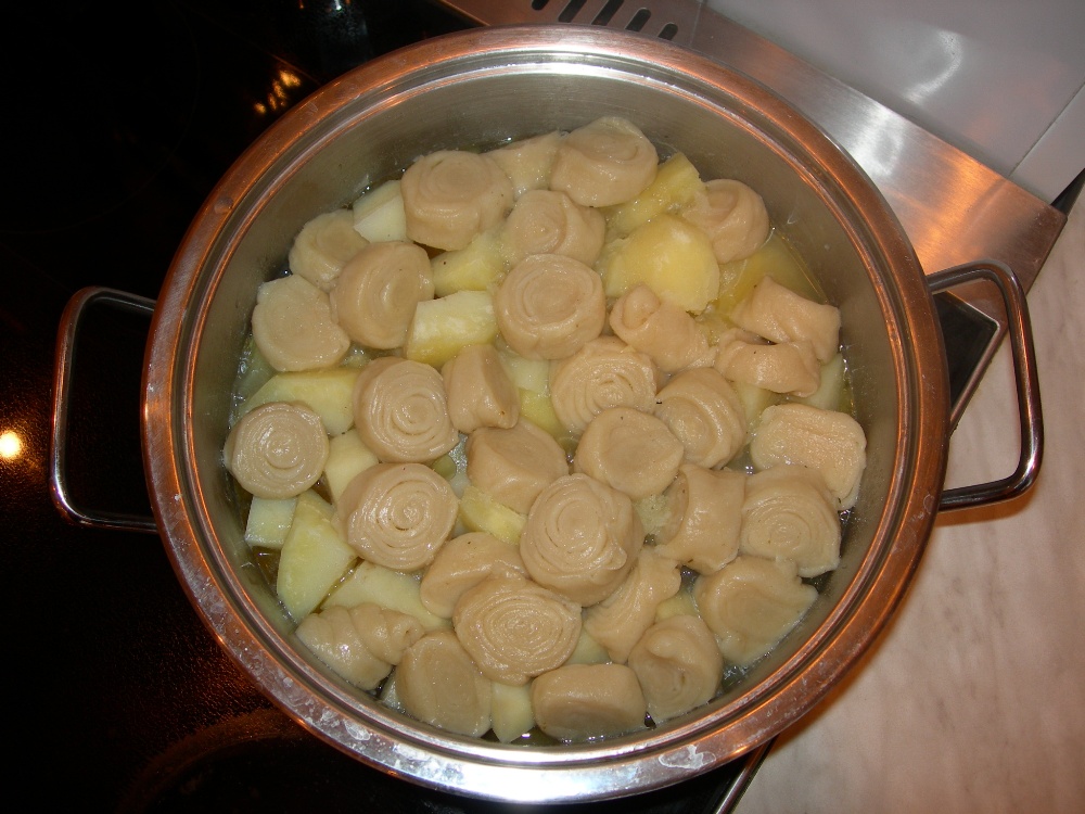 На дне кастрюли обжариваю лук с морковкой, туда же бросаю мясо порезанное (курицу или фарш, можно и говядину) обжариваю, затем слой сырой белокочанной капусты (перетираю с солью, чтоб меньше места заняла), затем картофель крупно порезанный, специи какие любите. Пельменное тесто(1 яйцо, 2/3 стакана воды и 2 стак муки) раскатываю в пласт, смазываю растительным маслом, скручиваю в рулет и нарезаю кусочками. Эти кусочки выкладываю на картофель и все заливаю кипятком до уровня картошки(тесто будет готовиться как бы на пару), закрываю крышкой и готовлю минут сорок. Можно экспериментировать: я сегодня добавила кабачок, кто-то в обязательном порядке кладет горсть квашенной капусты, посмотрите в инете, много есть вариантов. Я пробовала заранее готовить рулетики из теста и замораживать их тогда приготовление блюда занимает совсем мало времени