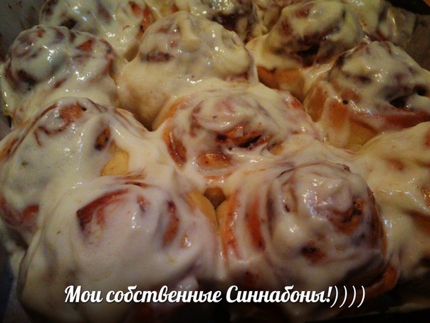 Не за что))) а теперь для тех, кто любит с орехами Тесто делается также. Тут дело в сиропе. В небольшой кастрюле довести до кипения 100 гр сливочного масла 1,5 стакана сахара 1 стакан меда 2 ч. ложки сахарного сиропа ( но все получается сладко, можно просто 1 ст ложку воды) Как только закипело (смотрите, чтобы сахар хорошо растворился), добавляем 2 ст. ложки корицы и 1 ч.л ванили. и сверху посыпаем толчеными грецкими орехами (0,5 стакан). Как только мы скрутили наши синнабоны, выливаем нашу заливку на противень (я делала в большой сковородке, чтобы они больше пропитались) и в духовку на 15 минут на 170 гр. Достаем, накрываем фольгой и еще минут на 20. Все, достали и минут через пять перевернули на тарелку. Вложение: