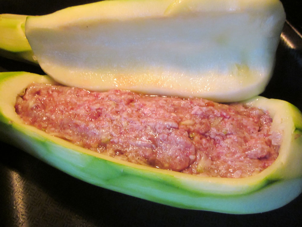Вырезать у кабачка бочок в виде продолговатой крышки,вынуть сердцевину ложкой,натереть солью снаружи и внутри.Зафаршировать фаршем мясным,можно с добавление риса или тертого кабачка,картофеля,можно кубиками порезать картофель,с луком или чесноком,не забыв посолить и поперчить.Все в духовку на 1 час,периодически поливая соусом из сметаны или майонеза с томатом.Получается как в горшочке томится начинка.Потом порезать кружочками и подать со сметаной.Приятного аппетита!