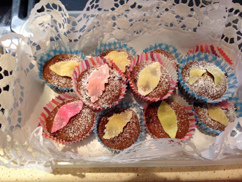 мука пшеничная – 200 г; темный шоколад – 1 большая плитка; сахар-песок – 70 г; какао-порошок – 2 ст.л.; яйца куриные – 3 шт; масло сливочное – 150 г; разрыхлитель – 2 ч.л.; ванильный сахар – 1 ч.л.; изюм без косточек – полстакана. Рецепт маффинов шоколадных: 1. Масло комнатной температуры растираем в миске с яйцами, какао и сахарным песком. 2. Затем добавляем нарезанную кубиками шоколадную плитку, перемешиваем. 3. После этого насыпаем разрыхлитель, ваниль, муку и замешиваем тесто. 4. Промытые ягодки изюма подсушиваем, перемешиваем с небольшим количеством муки, чтобы они равномерно распределились по сдобному тесту. 5. Выкладываем в тесто и еще раз перемешиваем. 6. Подготовленное тесто накладываем в небольшие смазанные маслом, металлические, бумажные или силиконовые формы (в последнем случае можно просто сбрызнуть водой), заполняя примерно на две трети объема. 7. Помещаем в разогретую до 180-200оС духовку и выпекаем до готовности около 20-25 минут. Вынимаем готовые маффины из духовки и сверху украшаем глазурью, посыпкой, пудрой и т.д. Пусть вас не смущают простые рецепты блюд – манников, сметанников, медовиков, пирогов, кексов, – приготовленные правильно и с душой они не уступят по вкусу и сложным десертам. На утренник в гимназию тематика "Осень" точнее на чаепитие после мероприятия пекла маффины украшала листочками из марципана делала и посыпала сахарной пудрой получилось опавшая листва припорошило снежком
