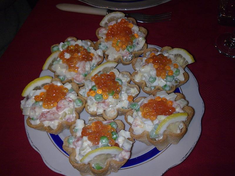 5 вареных яиц 250-300 гр слабо-соленой семги-форели (что-то одно на выбор) 2-3 соленых или конс. огурца 3-4 картофелины в мундире 1 баночка конс. горошка(или можно положить грамм 200 отварного горошка из отдела замороженных продуктов) майонез черный перец,солить не обязательно Лимон и красная икра для украшения. Все нарезать кубиками. Украсить икрой и лимоном. Как вариант можно сервировать в тарталетках. Фото не мое, знакомого, от которого и узнала рецепт