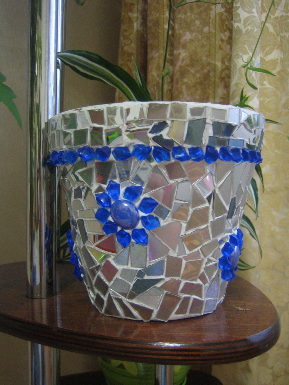 цветочный горшок, задекорирован мозайкой из CD дисков