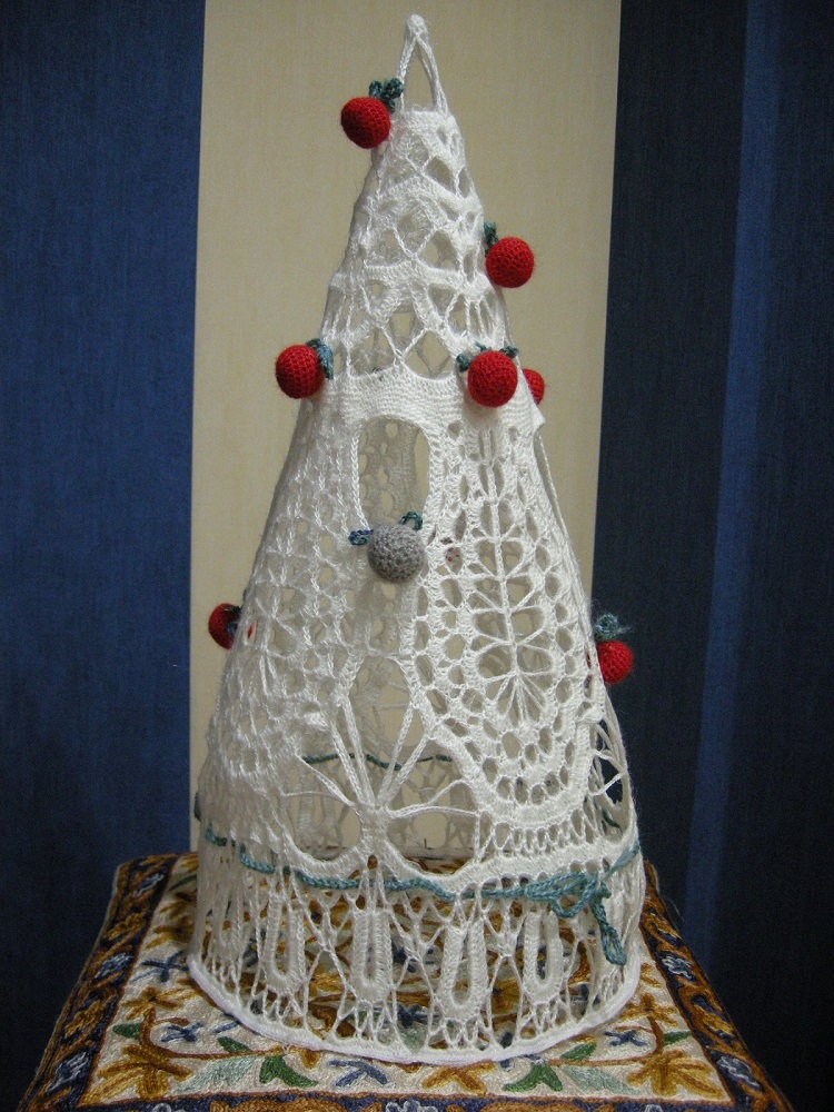 Это схема японской салфетки, но можно взять любую, какая нравится - взяла 1/4. Получилось внизу широко - утягивала последним рядом. Надо брать 1/6 или 1/8 - тогда ёлочка аккуратная получается, но у меня была ангора - она не распускается, поэтому оставила, как есть. Натягивала на конус из картона, обёрнутый плёнкой. |