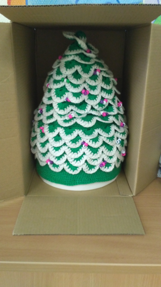 Я вязала ёлку-крышку для упаковки подарка в круглой коробке