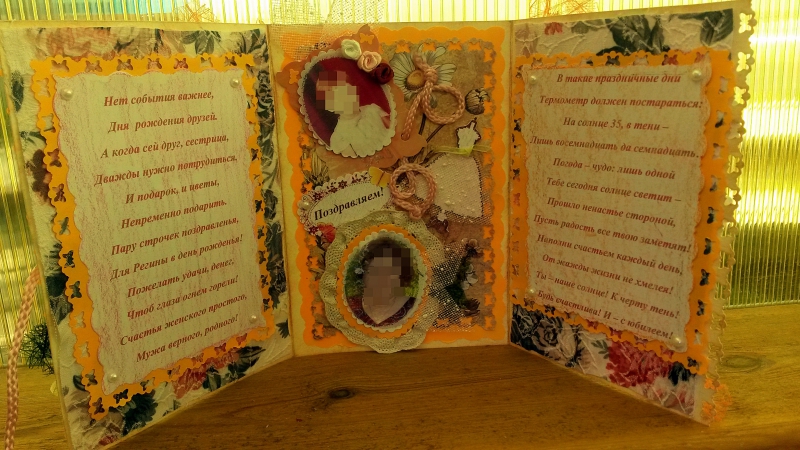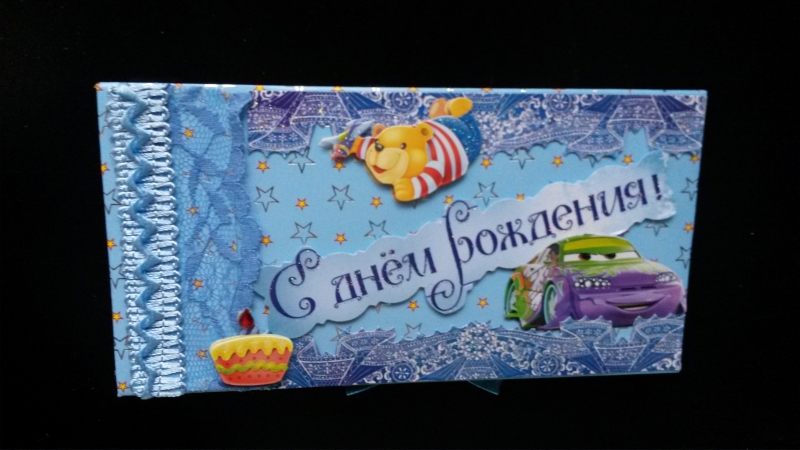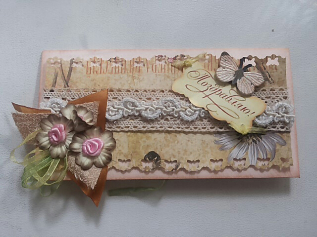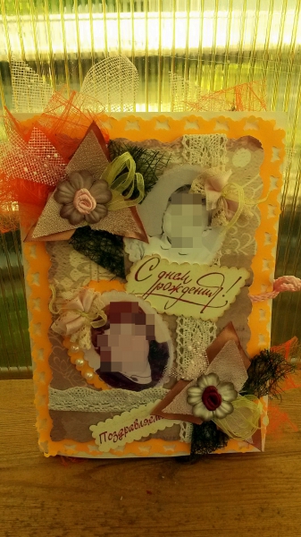 И хотела еще показать открытку. На выходные в гости ходили к сестре. К подарку нарукодельничала. Получилось вроде неплохо. Сестра осталась довольна