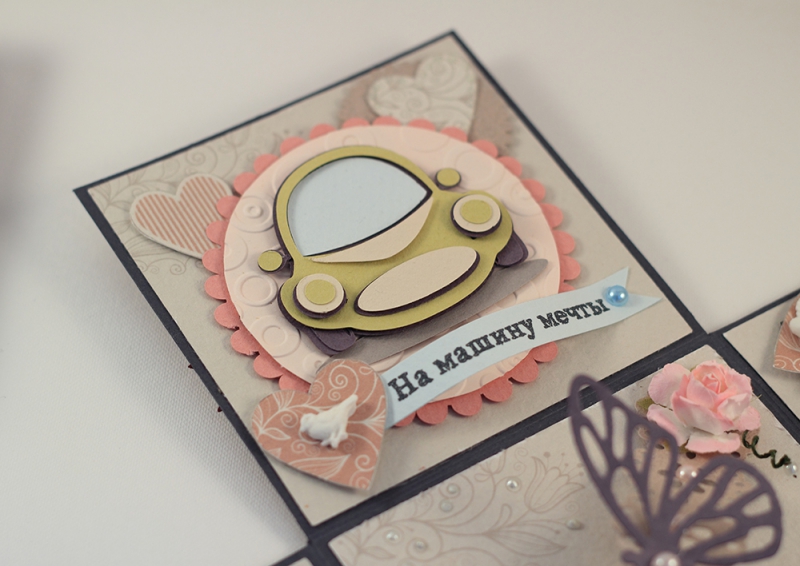Сделали мы открытку, больше делал муж, чем я...получилась симпатично вроде, особенно для первого раза. Цвет картона серо-фиолетовый
