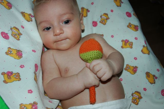 Это мой первый эксперимент. Хотя голова от идей разрывается, а времени на всё нет.. Внутренности погремушки тоже сама делала.. Очень удобна в ручку малыша ложится :) и приятная на ощупь :)