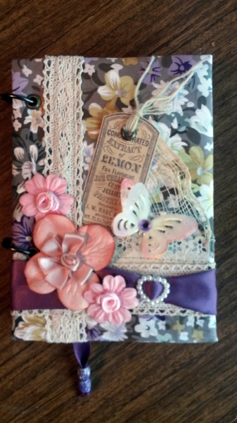 Страницы состаривала кофем, тесьму тоже в кофе поварила для создания бежевого цвета. Использовала на обложке - ткань ситец, цветы бумажные и атласные, стразик фиолетовый, лента атласная фиолетовая, люверсы, пряжка для лент сердце, бабочки надыроколенные из бумаги и из кальки (отдельное спасибо Марии-Бурундучок), х/б тесьма, бумага ScrapBerry's Версаль карточки Двор министров. Штампик угловой для страниц. Вложение: Вложение: |