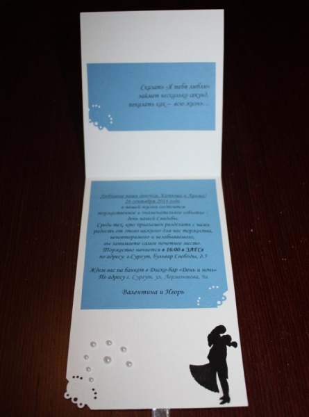 valjacka писал(а): : 1.10.2014 22:03 выходила тут на днях замуж решила порадовать родных и знакомых пригласительными сделанными собственно ручно вот что вышло может простовато, но и на это у меня ушла куча времени, фигурки все были вырезаны руками маникюрными ножницами, покрашены кисточкой акриловой краской... на каждом пригласительном была своя фигуркаКлассно получилось! Мне понравилось! Приглашенным наверняка тоже приятно было получить такие пригласительные. ![]() |