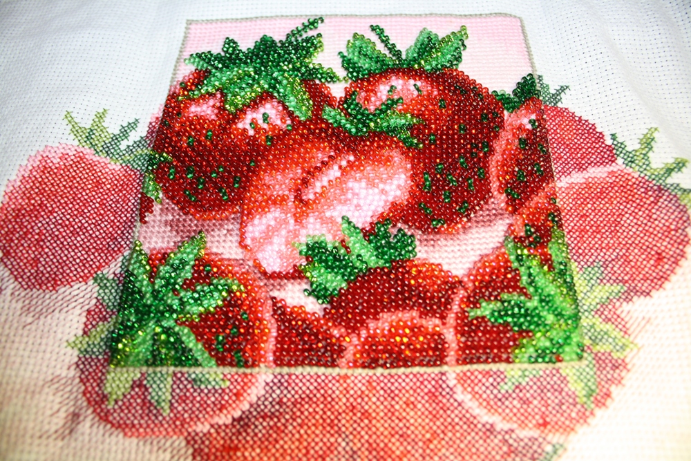 А я к вам девочки зашла похвастаться. закончила свои клубнички от "Чаривной мить" - крест с бисером. вот как не старалась, но не получается передать весь блеск бисера. в живую все гораздо ярче