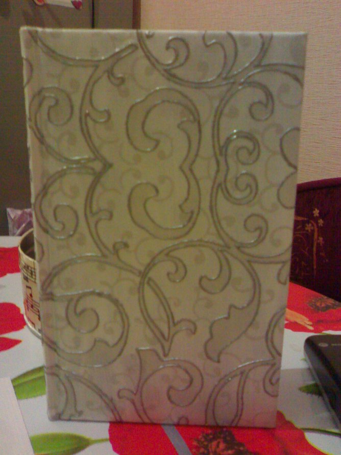 Первое фото это я только нанесла салфетку на ежедневник, и с радости, что морщинок нет фоткать давай)))) а потом уже обвела рисунок контуром, дала высохнуть и лаком сверху)))) и вот вам подарочек готов!!!!