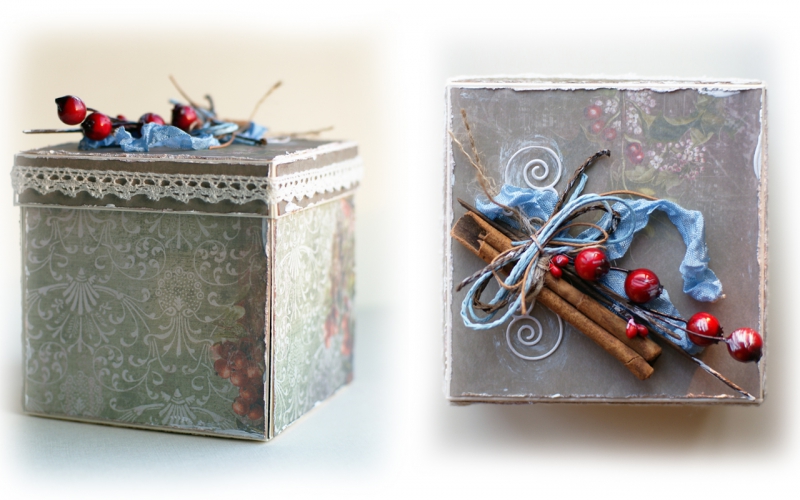 Для такой коробочки мне понадобились следующие материалы: бумага для пастели, 2,5 скрап.бумаги 30х30, веточка ягод, шебби ленточка, вощеный шнур, шнур бумажный крученый, палочка корицы, чай из Китая, вырубки (завитушки, снежинки, фигурные), шпагат, кружево, мешковина, 1/2 крафт.листа, тэги, пуговица, бусинки и полубусинки, бутылочка, рамочка из полимерной глины, пивной картон.