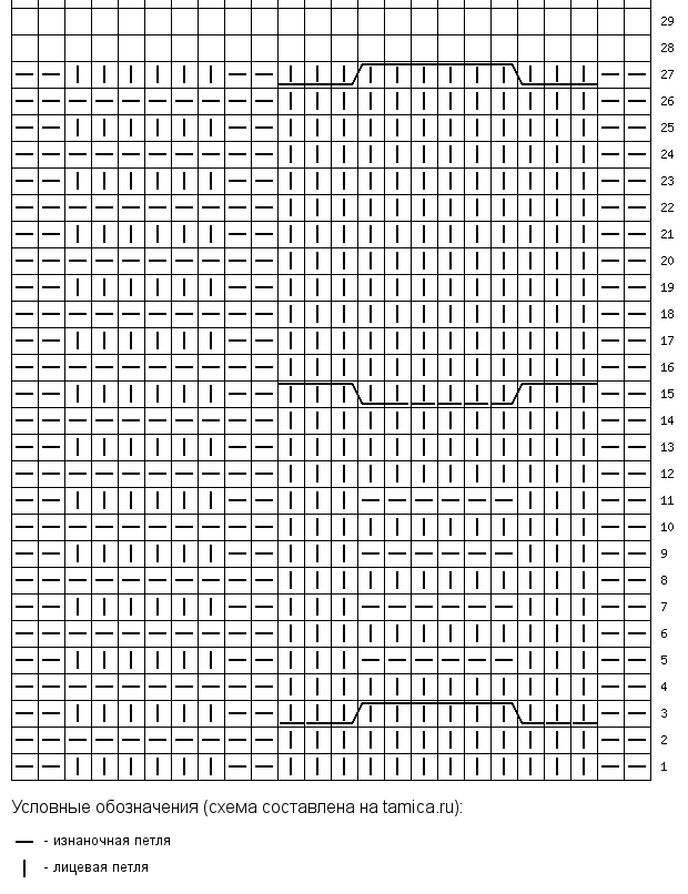 Дана лицевая сторона - т.е. словно вяжете по кругу. Если поворотными рядами, то, соответственно, по рисунку - над лицевыми лицевые, над изнаночными -изнаночные, кроме участков с платочной вязкой. 27 - это 3 ряд. Удачи Хотя я снуды не поняла - себе связала - продувает и неудобно ни как шарф, ни вместо шапки ![]()