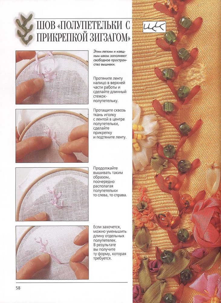 Поищите видео, я таким способом училась лентами вышивать 5 лет назад. Тогда очень мало было информации,сейчас должно быть много |