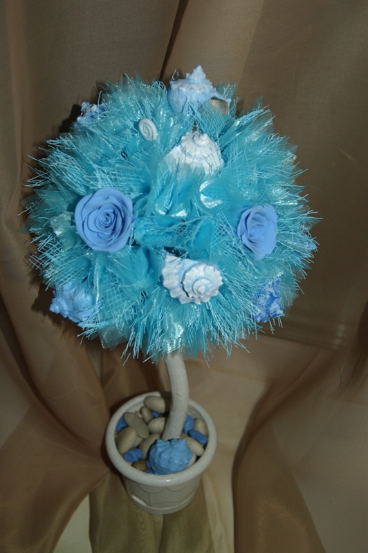Ракушки настоящие, покрасила акриловыми красками. Торцовочки из органзы и сетки голубой. Розочки лепила из полимерной глины. В горшочке камушки с моря, ммммм ![]()