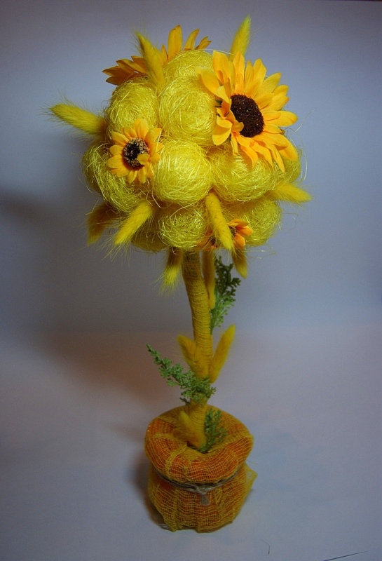 Новый топиарий, Подсолнух. Сизаль, лагурус, искусственные цветы, сетка флористическая.