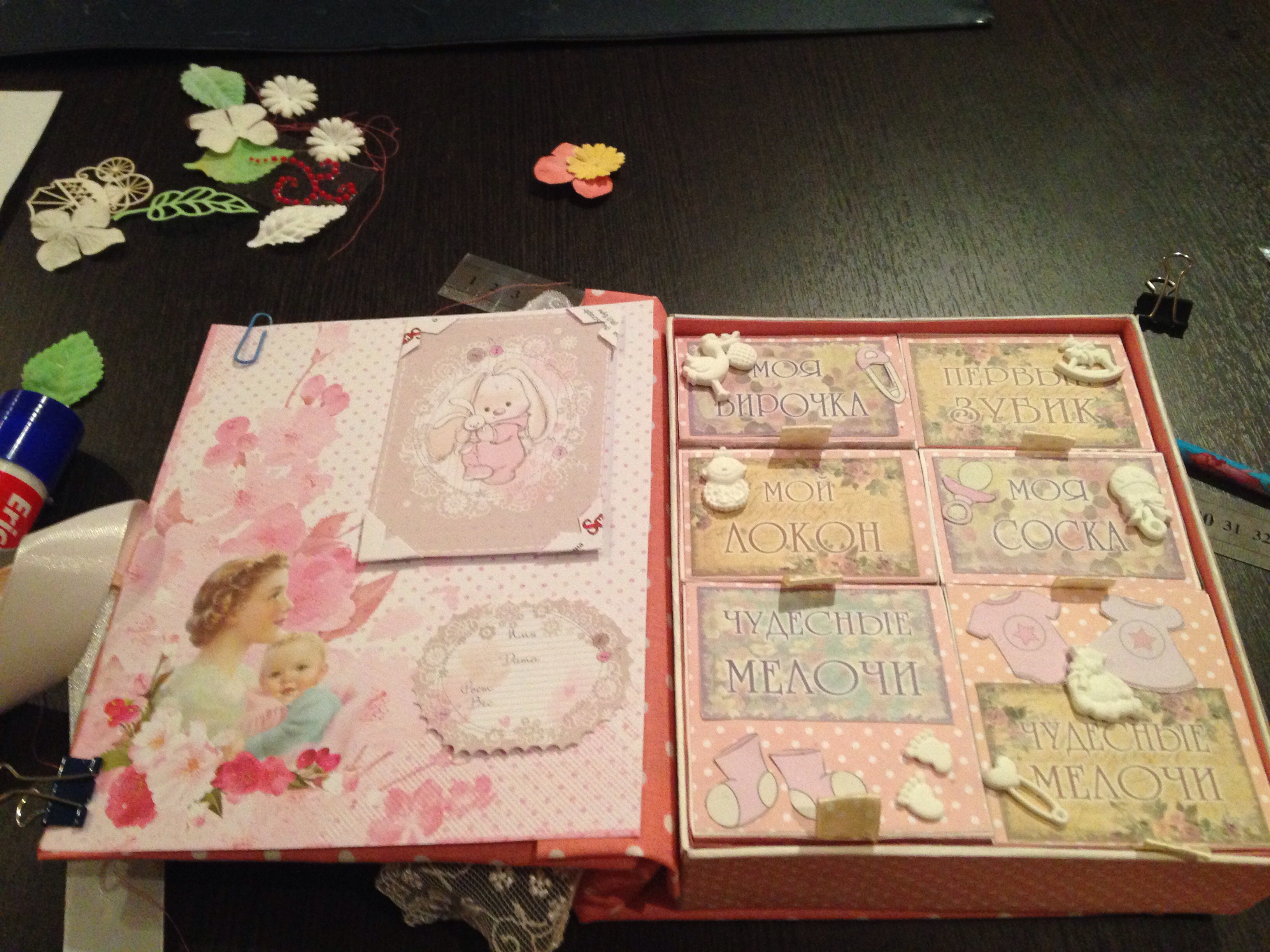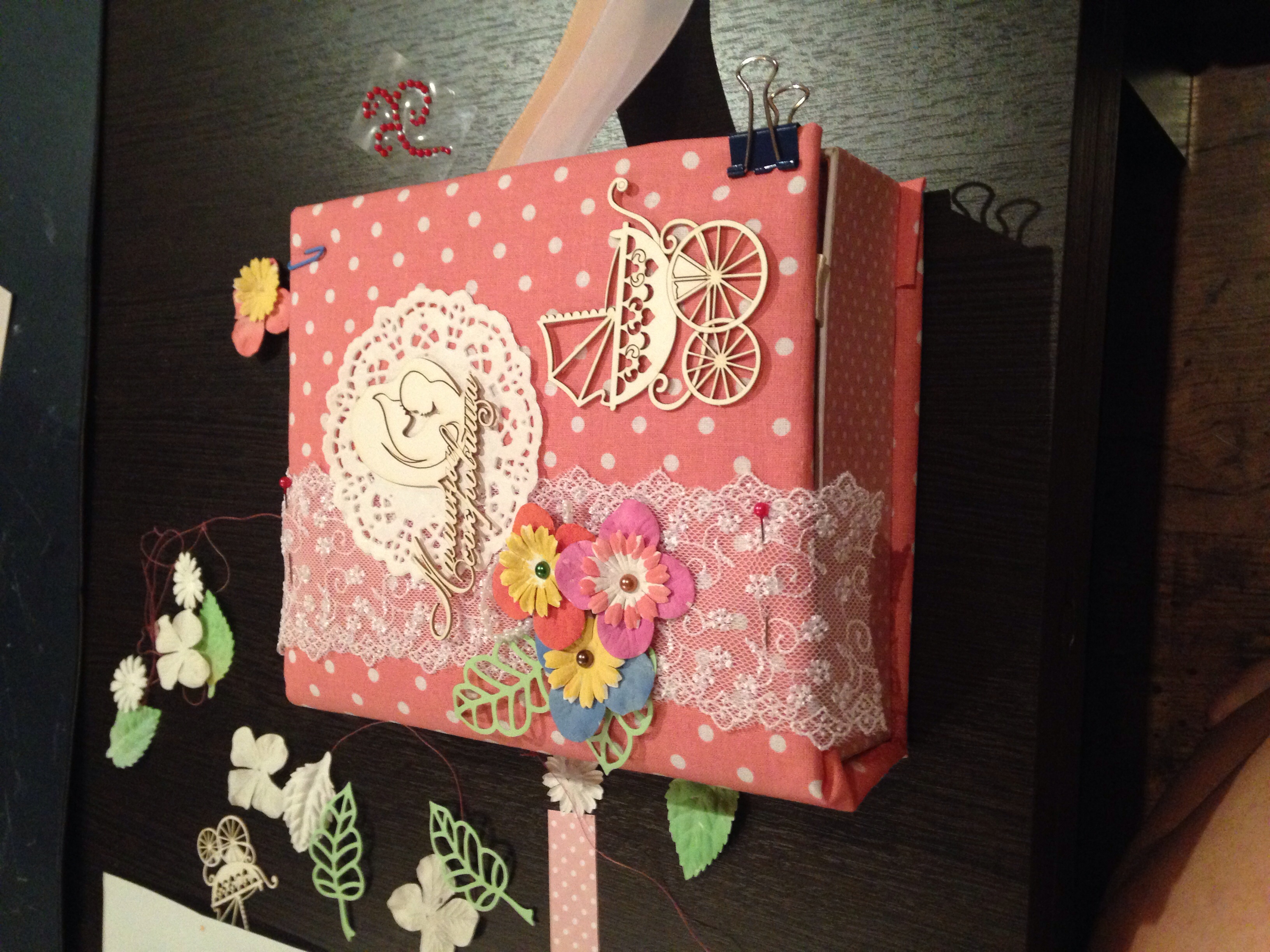 Девочки, посмотрите пожалуйста своим опытным взглядом правильно я расположила украшения? Делаю первый разна подарок, опыта в этом деле у меня ни какого нет. Буду очень рада услышать комментарии. Обложка пока в процессе, вчера хотела про строчить ткань, а моч машинка этого совсем не хочет( сращу рвет нитку, не знаю что с этим делать)