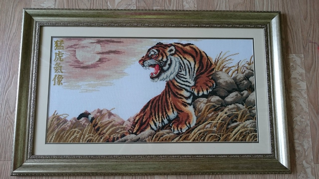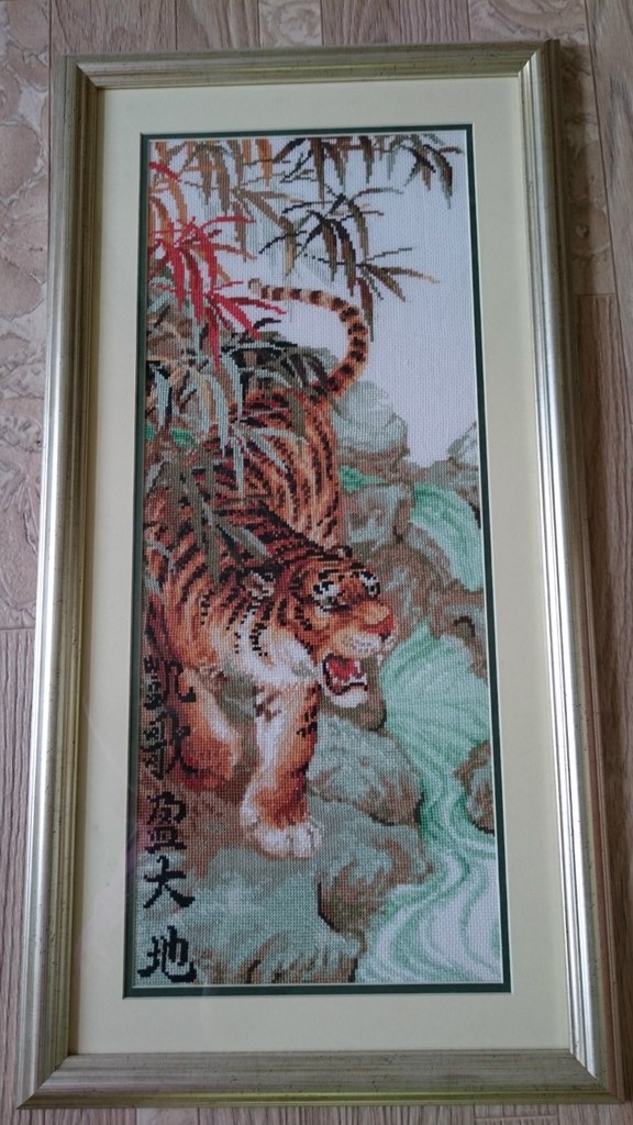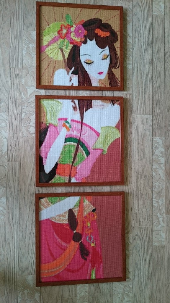 После приезда в Сургут из относительной теплой зимней Москвы, стало нечего делать холодными зимними днями. Так что заболела вязанием лет этак на 5. Покупала картины в местных магазинах. Из того что было выбирать долго приходилось. Потом познакомилась со всеми известным китайским сайтом и картины значительно выросли в размерах. Лежит теперь следующая работа метр на полтора. Вышивать теперь удается значительно медленней, т.к. познакомилась с алмазной мозаикой, а ее делать намного быстрее. Да и дочка родилась и вязание стало еще приоритетнее.