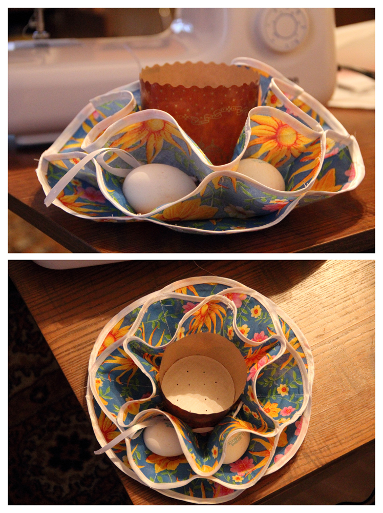 Салфетка для кулича. МК нашла, по-моему, на Осинке. Вырезала три круга, края обшила косой бейкой и сшила края. На самом верхнем круге сделала отверстия, вставила фестоны и продела ленту.