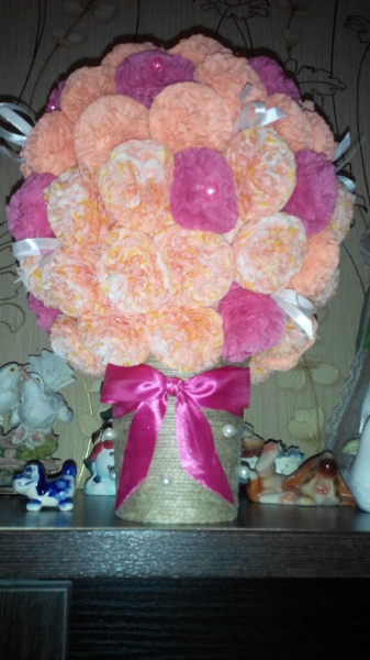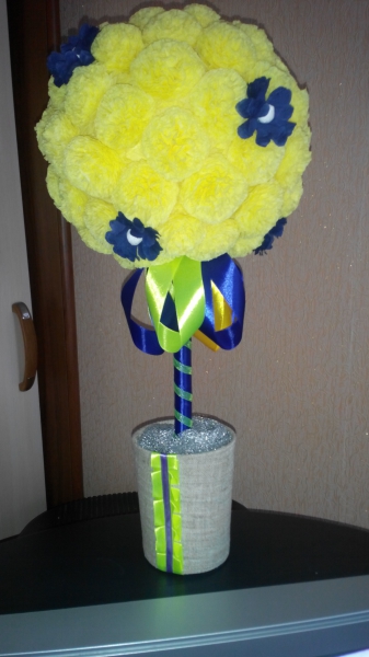 А вот мой первый топиарий из атласных лент, сыну в школу делала.