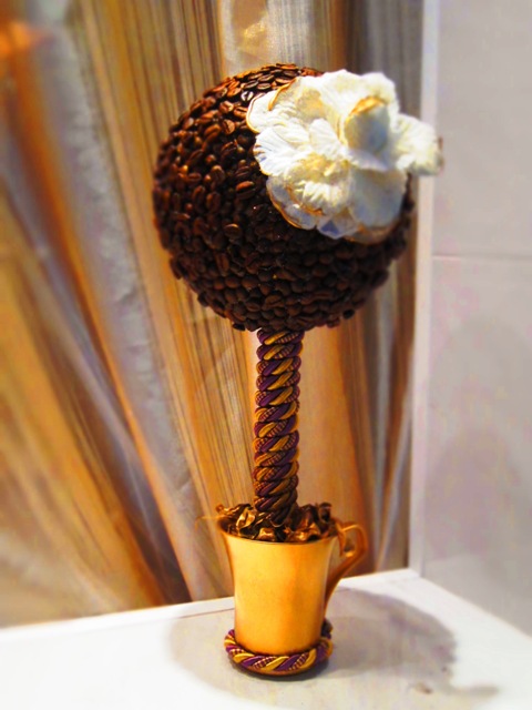 Вот так делалось моё деревце- на надутый шар,в три слоя налепила газету,разорванную на мелкие куски,на клей ПВА, потом на клеила кофейные зерна,с помощью термопистолета в чашку,налила,ротбант,после ремонта остался,чашку,красила акриловой краской из балончика. Вставила,туда ствол,к которому,был приклеплен шар,потом прикрепила цветок,от заколки и вуаля,всё готово...