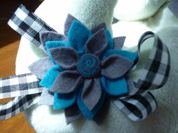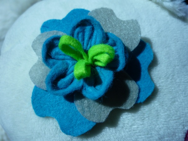 Вот, первый мой цветок. В жизни он чуток другой. Сделала на голову доче как аксессуар к наряду на НГ, но он мне понравился ещё как брошь.