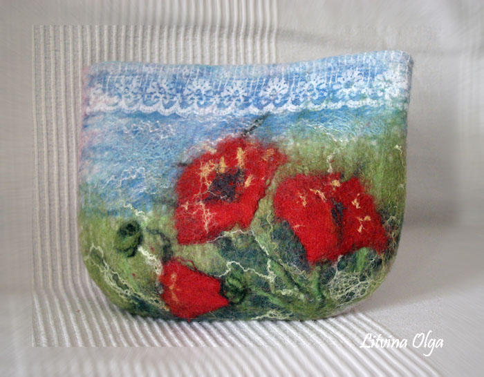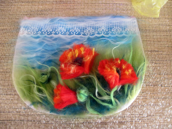 Ola-la мне кажется сначала надо было косметичку свалять, а уже потом рисунок, сначала иголочкой набить и потом маленько затереть. Ну это мое мнение конечно. Вообще я люблю картины по-сухому выкладывать красота не теряется и можно все поправить, а вот по-мокрому конечный результат неизвестен или надо сто вот таких кометичек навалять , чтоб руку набить.