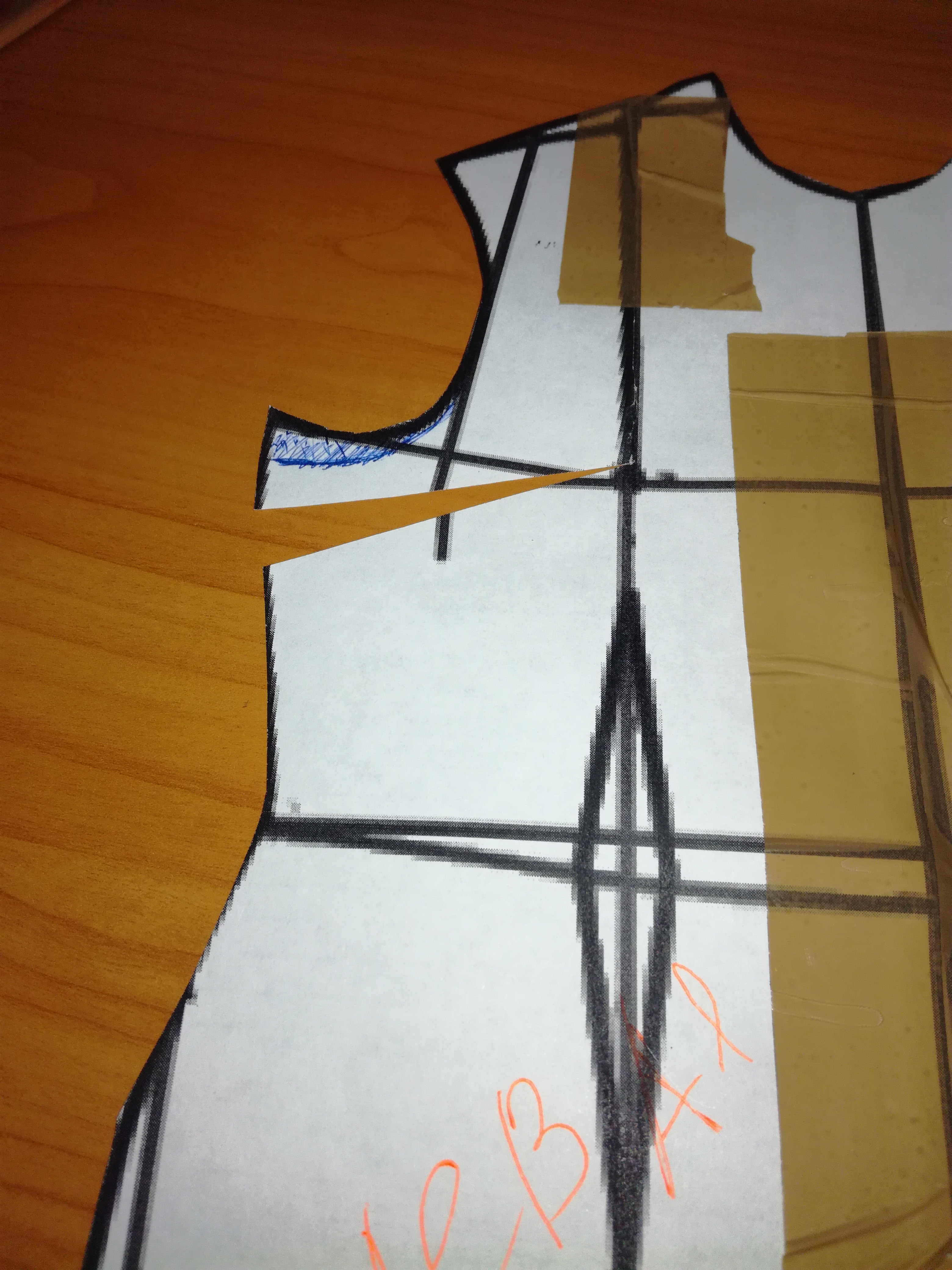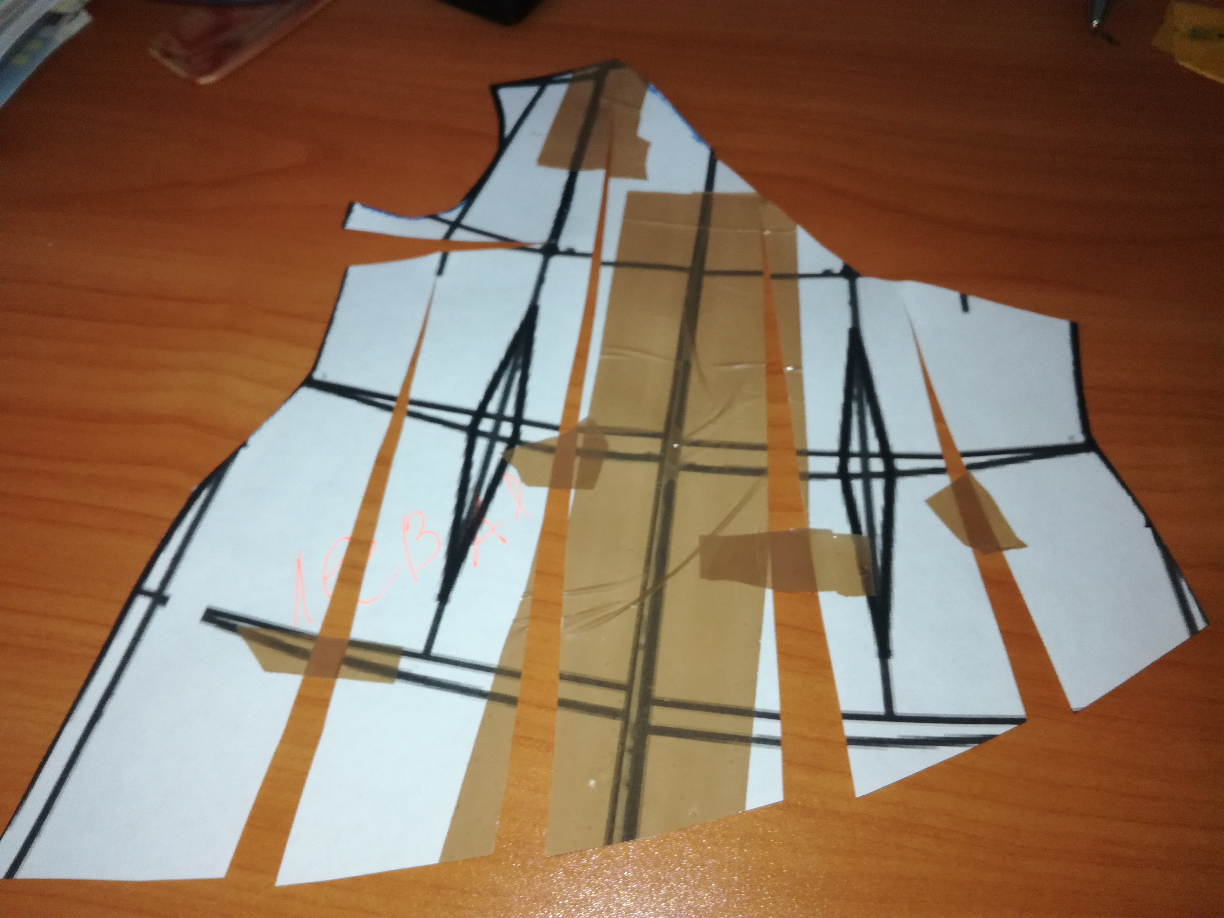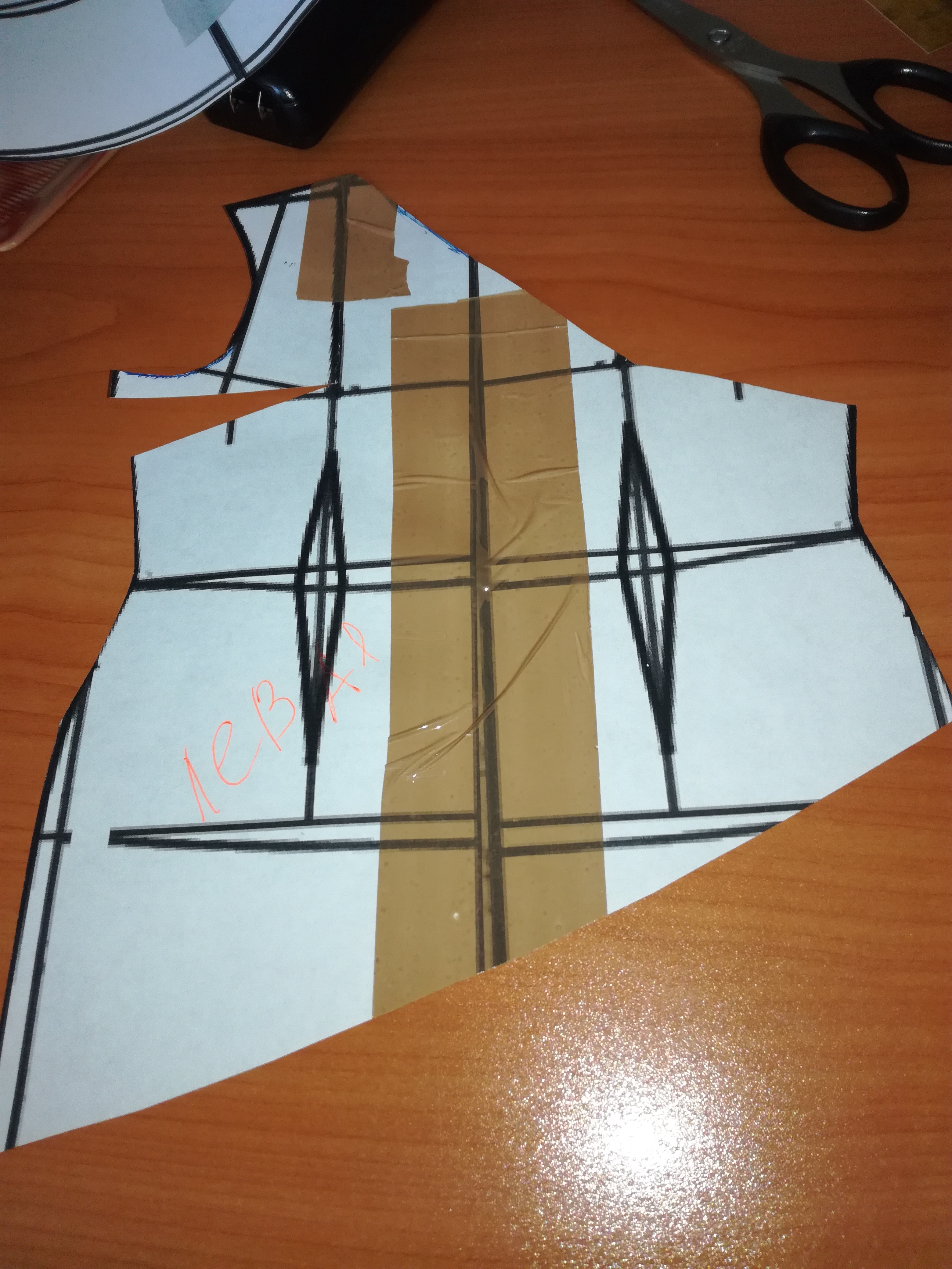 Пройму не трогать уже. В готовой выкройки вытачек не будет. Другая половинка делается в зеркальном отражении так же. На спинке вытачки тоже переводятся в бок, а потом всё аналогично. Ну и внутренние вытачки тоже не вырезаются, их не будет