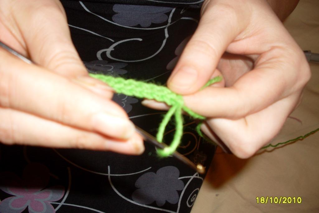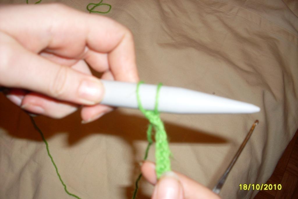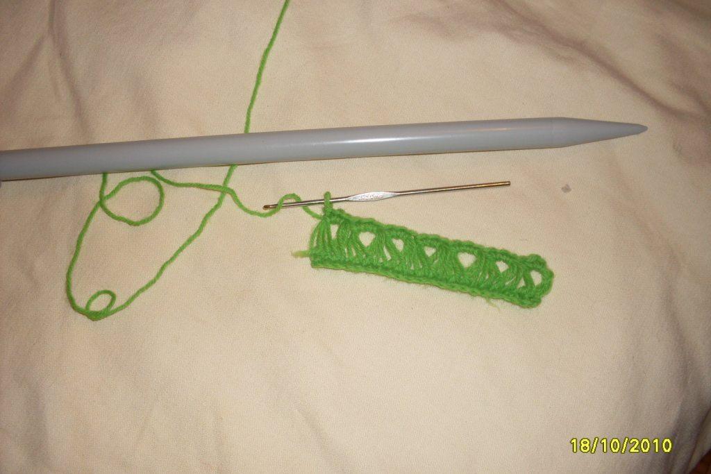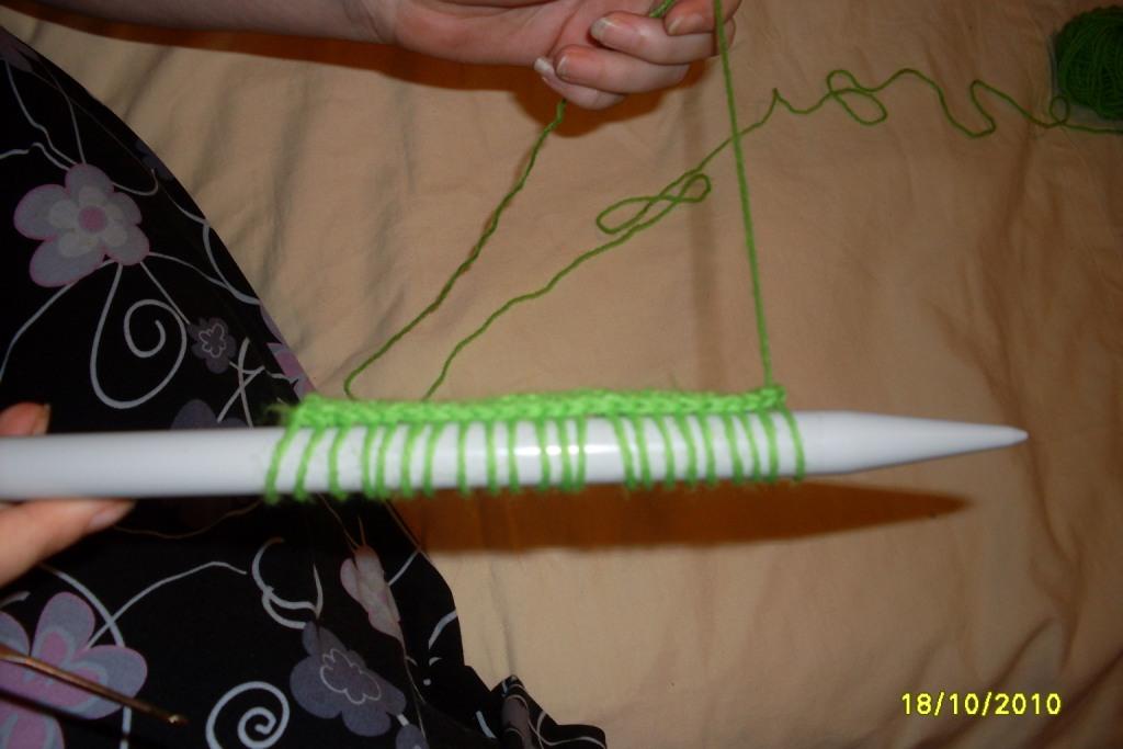 крючек вводим в нижележащий столбик, как при обычном вязании, вытягиваем длинную петлю и одеваем её на спицу