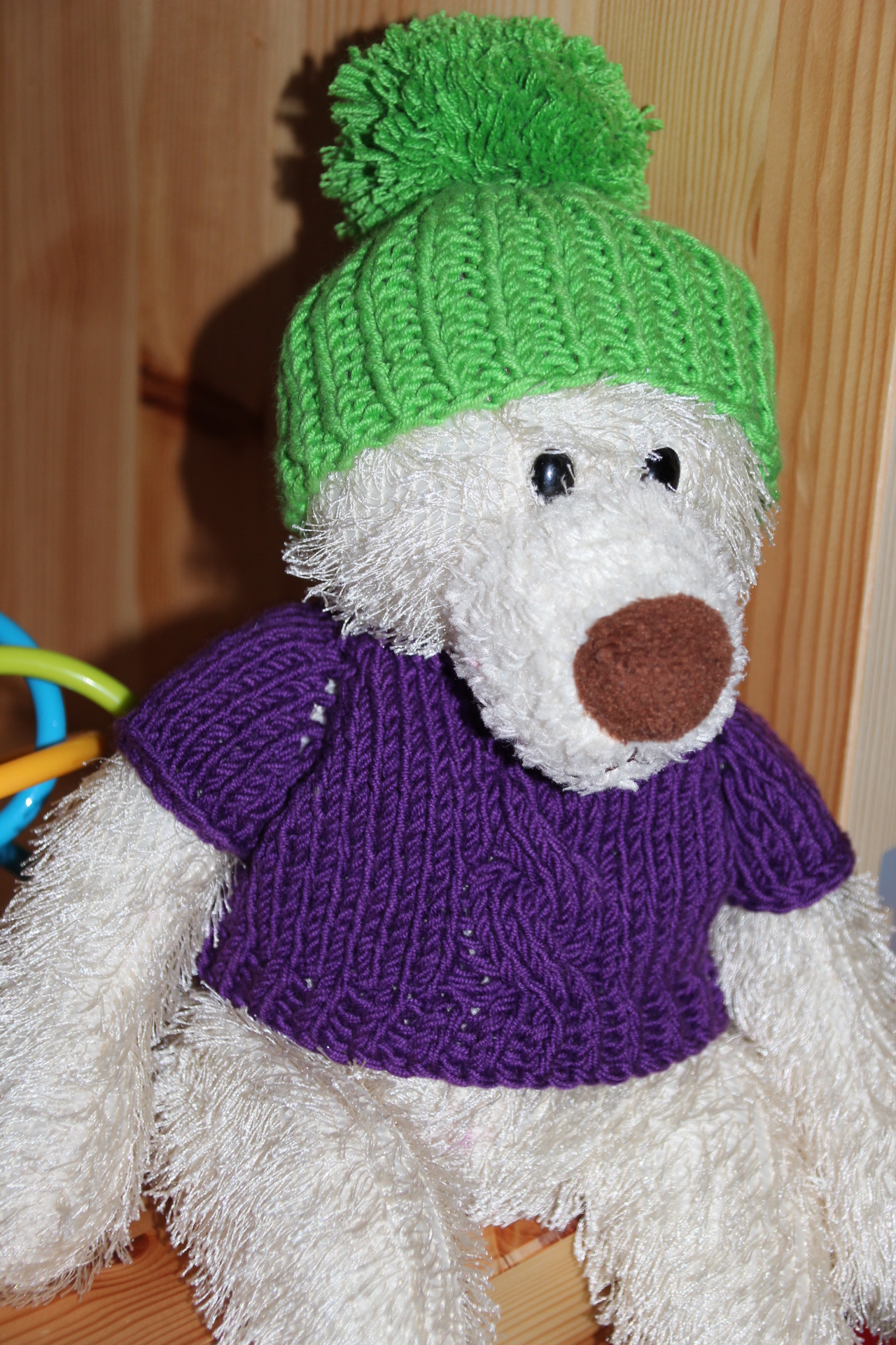 А я на выходных уделила внимание куклам и мягким игрушкам))) одела в зиму нашего медвежонка))) шапулю и кофточку забацала)))