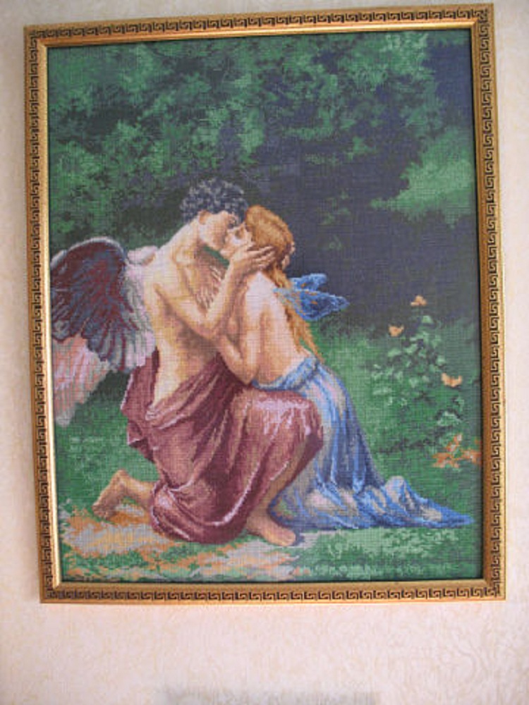 Вот и моя первая работа))спасибо Наташе (Стрекозе) за выставленный пристрой,я как увидела эту парочку,решила буду вышивать( прежде никогда не вышивая))) это "Амур и Психея" по мотивам Пауля Туманна. вышивала почти год, сейчас рукодельничаю над картиной 49/40 (ещё больше)) "МАРИЯ" ( мать Иисуса,с ним и барашкой на руках) в бежево-коричневых тонах) должно получится красиво! (как вышью,что произойдет не скоро)) выставлюсь. ( осталась схема,но состояние неочень,могу дать кто пожелает такую картинку)