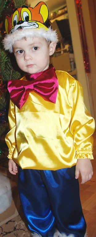 Похвастаюсь и своими "творениями". в прошлом году мы были Русским мальчиком - очень долго выбирала, что бы такое сшить БЕЗ головного убора - не одевал ничего. Вот и выбрала такой. В этом году - Кот Леопольд. Шила всё по образу и подобию штанишек и футболок - с них и мерки снимала. Ткань - стрейч-атлас. Нарядно и по-новогоднему получается. Маску-шапочку коту печатали на принтере, ламинировала клейкой лентой и одевала, как корону. У кота ещё сзади хвостик жёлтый пушистенький - пушистики как на шапочке. Ещё коту делала бахилы на сандалии в виде розовых тапочек кота - для завершения образа.