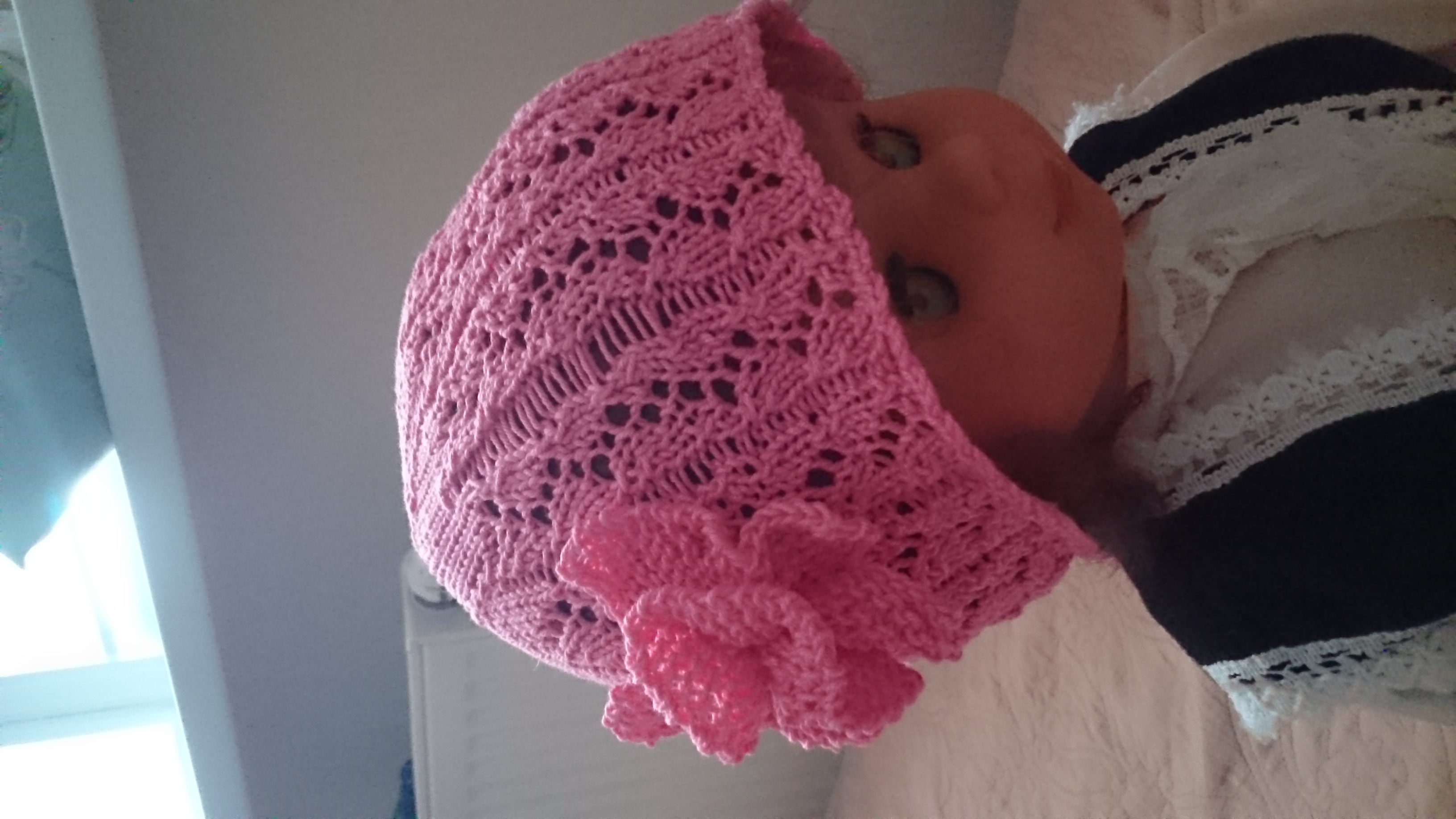 Вдохновленная Олесей Датура связала шапочку с цветочком для новорожденной девочки. Если кому надо схему описание шапочки, дам