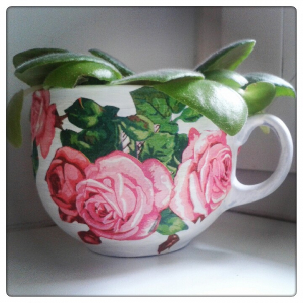 Чашка-кашпо . Чашка из обычного стекла была покрашена акриловой краской в три слоя. Затем выехала рисунок из трех слойной салфетки. Отделила первый слой и приложила к чашке. Предводительно смешала клей ПВА и воду Покрыла этой смесью картинки на чашке. Когда все высохло,покрыла лаком. Вот собственно и все!