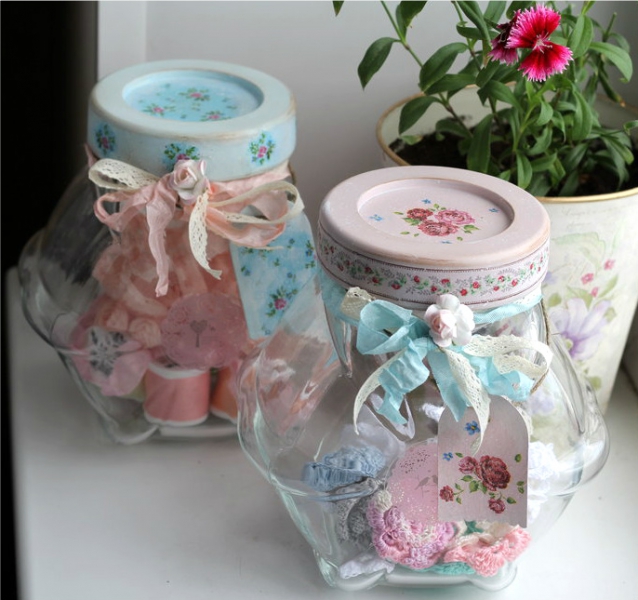 Спасибо:) Я что то покупала в Леонардо, что то в Кладовке, все с разных мест:) Ленточки шебби заказывала на ярмарке мастеров, но мне кажется можно и шелковые использовать:) Украшала бумажными цветочками их тоже не проблема найти в наших рукодельных магазинах. Салфетки обычные 3-х слойные, продаются в наших супермаркетах, самое главное красивые найти:)