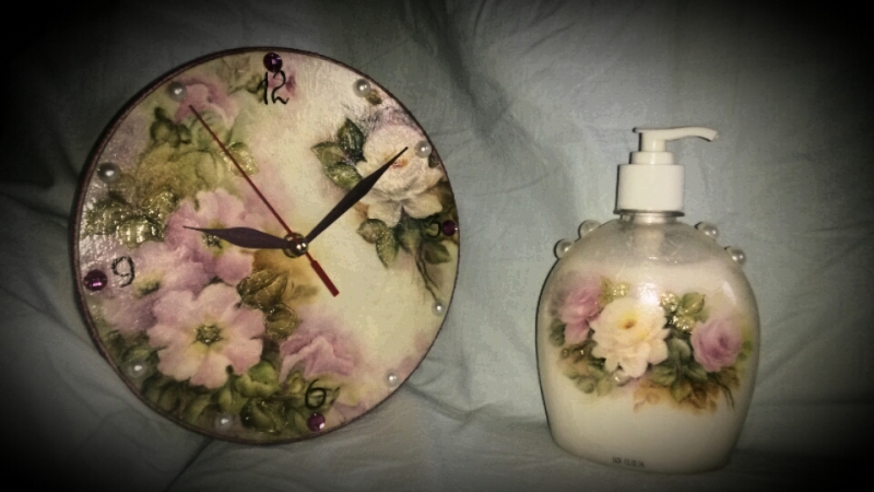 Делала набор на кухню. Бутылек с мылом и часы.