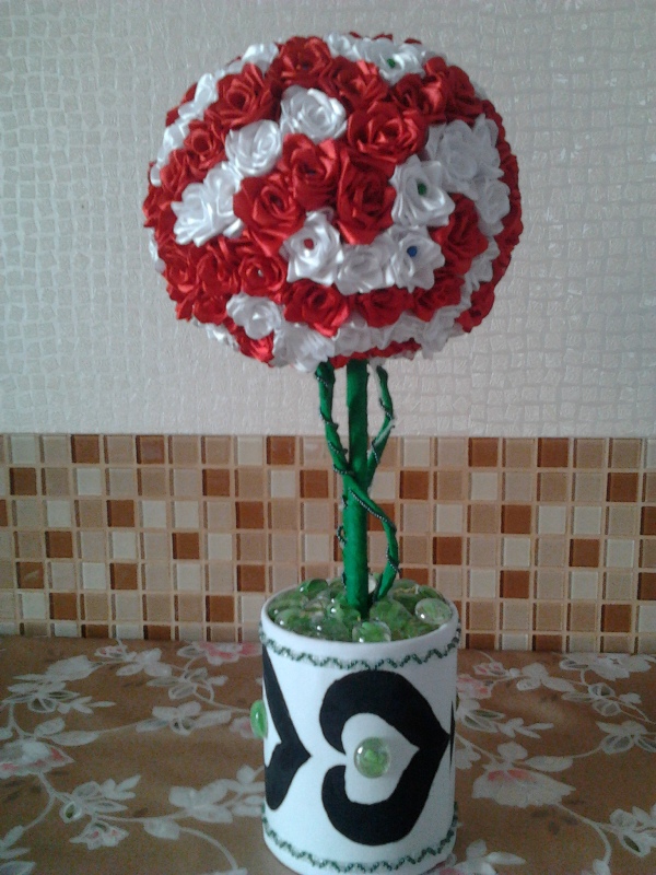 Цветочки делала сама из атласных лент, очень много времени ушло на это. Its_me Спасибо. Горшочек это обычная банка из-под детского питания в два раза обтянутая габардином на который через трафарет акриловыми красками нанесен рисунок + приклеенные стеклянные камушки и цепочка из бисера. |