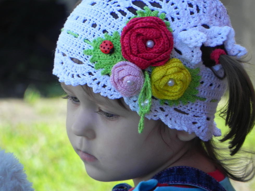 Тоже к лету косыночку и панамку доче связала, еще юбочку себе, а сейчас комплектик дочке вяжу шапочку и бактус