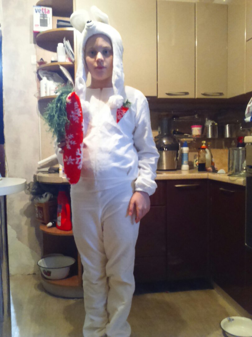 Я ограничена в финансах , а сын очень хотел костюм на НГ. Была в наличии шапка с ушами - купила 4 метра фленельки по 125 р. пару кусочков меха - на морковь и хвост и моток пряжи травка. Как говорят дешево и сердито.